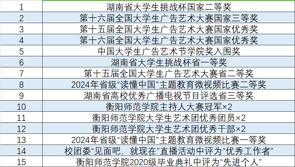 他在传媒领域表现卓越,于2024年湖南卫视&芒果tv青芒计划人才选拔中,以面试第一的成绩成为芒果导演预备役,团队及个人均获第三名,且作为青芒代表登上《你好星期六》与时代少年团同台。在竞赛方面成绩斐然,斩获第十六届大广赛全国三等奖、老员工挑战杯国家二等奖及省一等奖、第15届大广赛省二等奖、湖南省高校优秀广播电视节目省三等奖等众多荣誉。他还被衡阳团市委聘为“美食星推官”与青年品牌推介官,个人海报在全市投放。连续两次主持湘南师范生就业直播并受省级媒体报道,蝉联fun88乐天使两届主持人大赛冠军。在校担任艺术团舞蹈队队长,多次获评优秀队长与优秀志愿者,积极投身校园艺术活动,主持或参与校级院级活动近20 余项,在校园与传媒舞台上持续绽放光芒,展现出新时代青年的无限活力与才华。