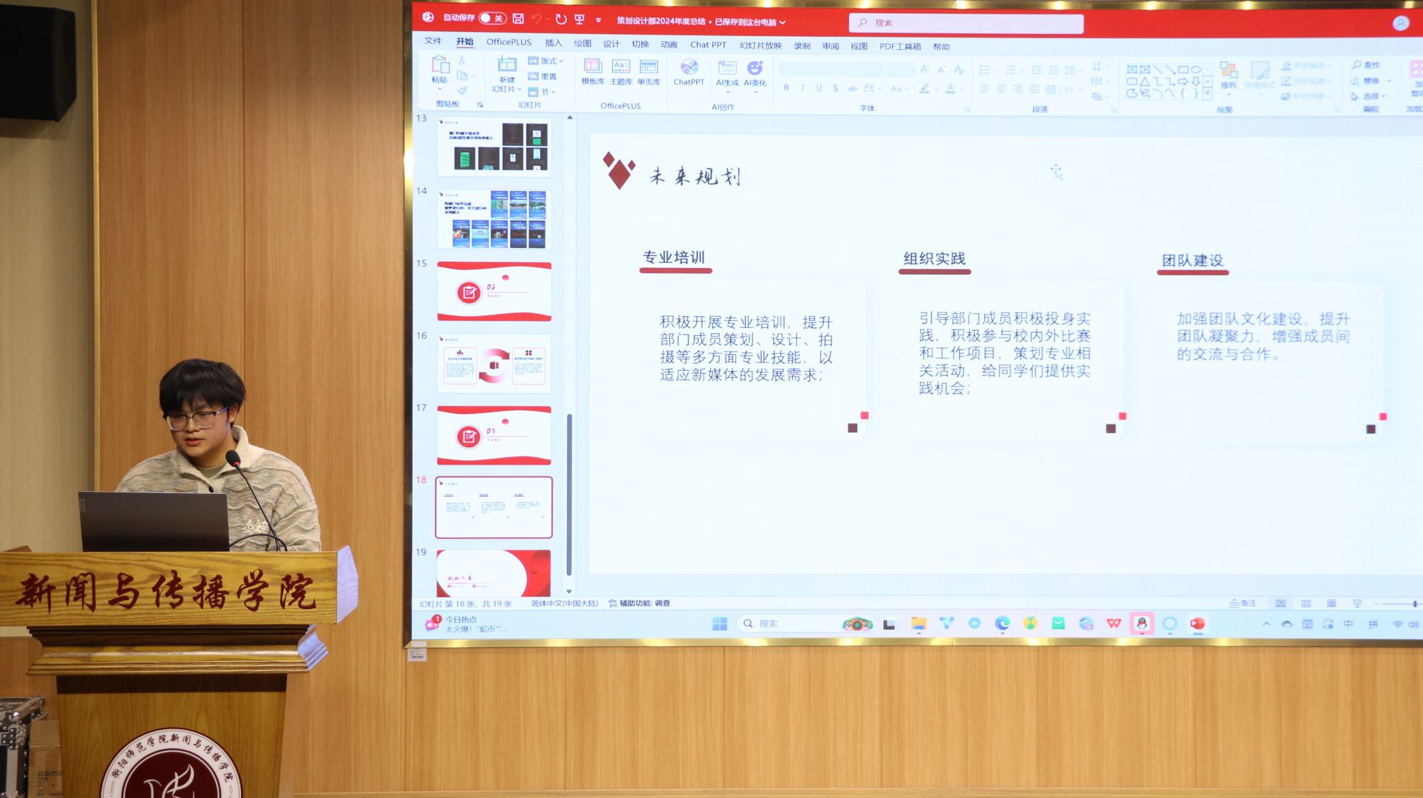 随后,各部门负责人上台进行部门总结。2024年影视部共参与40余次任务拍摄,推出30余件新闻作品,其中原创作品八件,包括发布在衡州城事的作品《视频|城管进行时|第三届湖南旅游发展大会“净美雁城,喜迎八方来客”》等;采编部共撰写超过52篇报道,22篇报道发布在衡师新传人上,超过20篇发布在衡州城事上,超过12篇发布在新湖南、红网、湖南日报等优秀省级媒体平台上;策划部近一年策划的活动主要有“春意盎然,绿意映像”摄影沙龙活动、fun88乐天使第十七届主持人大赛决赛暨湖南省第二届老员工“新声奖”主持人大赛选拔赛、“恒分类 衡美好”衡阳市2024年垃圾分类知识竞赛、“致敬环卫 扮靓雁城”庆祝湖南省第二十九届环卫工人节晚会,并为衡东文旅设计了创意IP“戚侠”、“采侠”和文创周边,为垃圾分类知识竞赛设计了系列海报等。