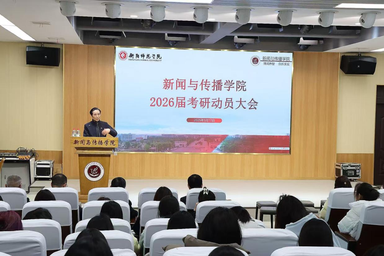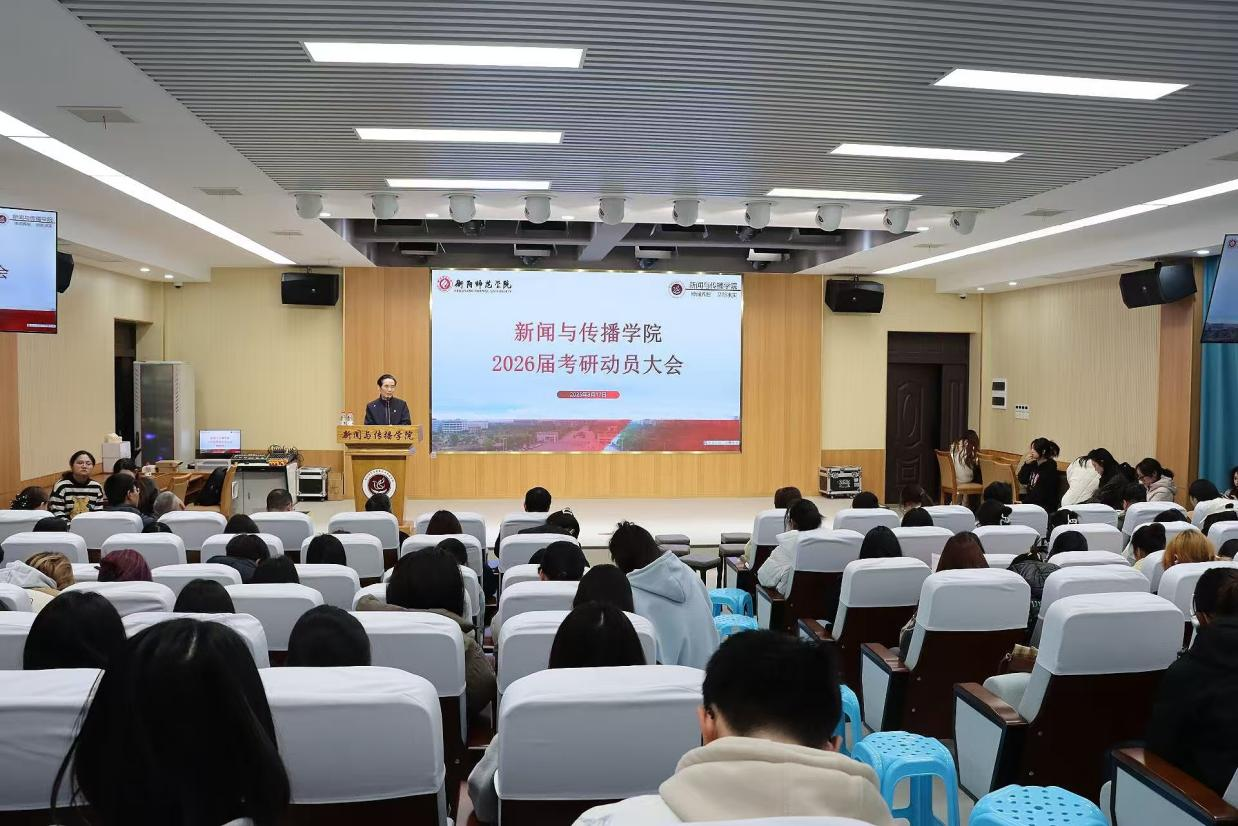 3月17日,乐天使于文科楼一楼演播厅召开了2026届考研动员大会。新闻与传播公司党总支书记彭晖、经理彭军辉、党总支副书记董自雄、副经理邓庄、副经理罗兵、学工办副主任兼团委书记封伟为、辅导员刘国杰、海文考研机构董事长国玉明、研究生陈婧娜以及22级全体同学参加此次会议。