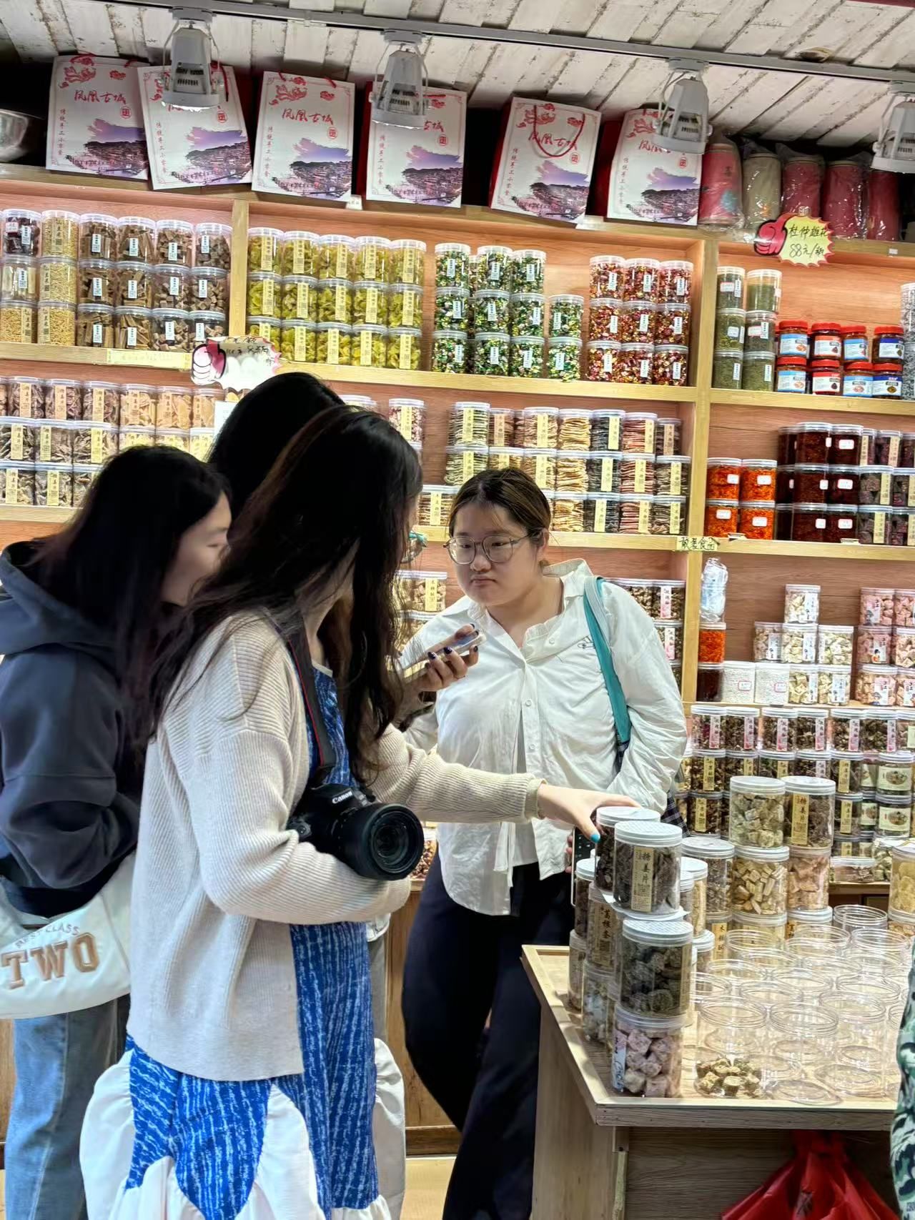 今天我们去张氏姜糖记拜访了一位老师傅,在美妙的气息中,他熟练地打糖、切糖、装糖盒,快刀斩乱麻,师傅手法熟练,亲切热情,向我们讲述他学习制糖的往事。亲自体验过制糖后,我们发现这并非易事,更敬佩这种工匠精神,粘稠的糖浆搅入历史的醇厚,凤凰古城抗争中的不屈带来辛辣,而人民的热情善良则是甜蜜的来源。