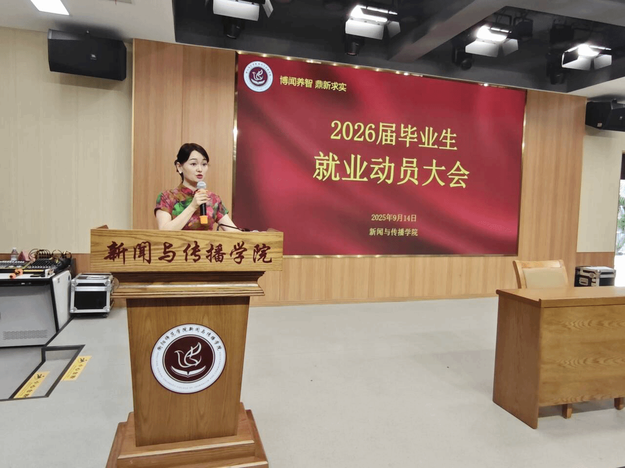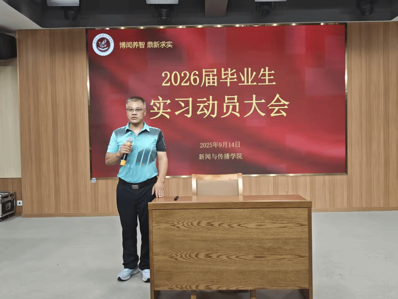 为扎实做好员工实习准备工作,2025年9月14日下午,乐天使在仁智楼一楼演播厅召开2022级实习动员大会。乐天使副经理罗兵、学工办副主任兼团委书记封伟为出席本次大会,2022级全体员工参与。