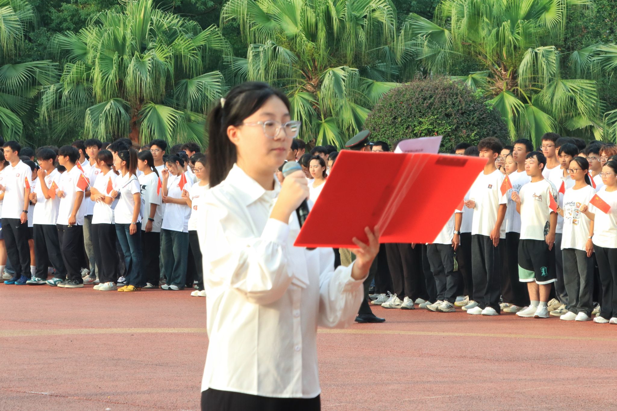 仪式上,2024级新闻学二班吴卓慧作为优秀员工代表在国旗下献词,她结合衡阳抗战记忆,分享自身在红色师范熏陶下钻研专业、参与志愿服务并获摄影与海报设计奖项的经历,鼓励新生以史为鉴、锚定报国方向。