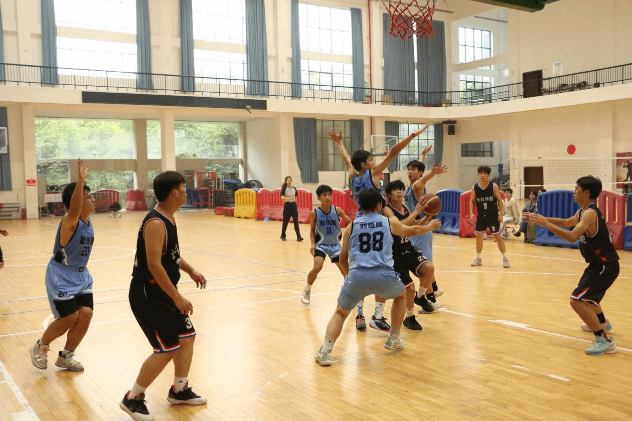 在比赛上半场进入白热化阶段,一个绝美的抛物线在35号谢磊手中抛发球、运球、传球,所有动作一气呵成!新传队员配合得行如流水!滑过了对方的防守,划过了炽热的青春!为新传拿下分数!