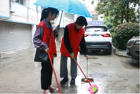 首先,志愿者们分为三组,一组清扫社区楼梯过道。其余两组看望老人并帮助他们打扫卫生。因为下雨,社区过道上有很多落叶,志愿者们在简单分配任务后,对社区各处的落叶进行重点清扫。