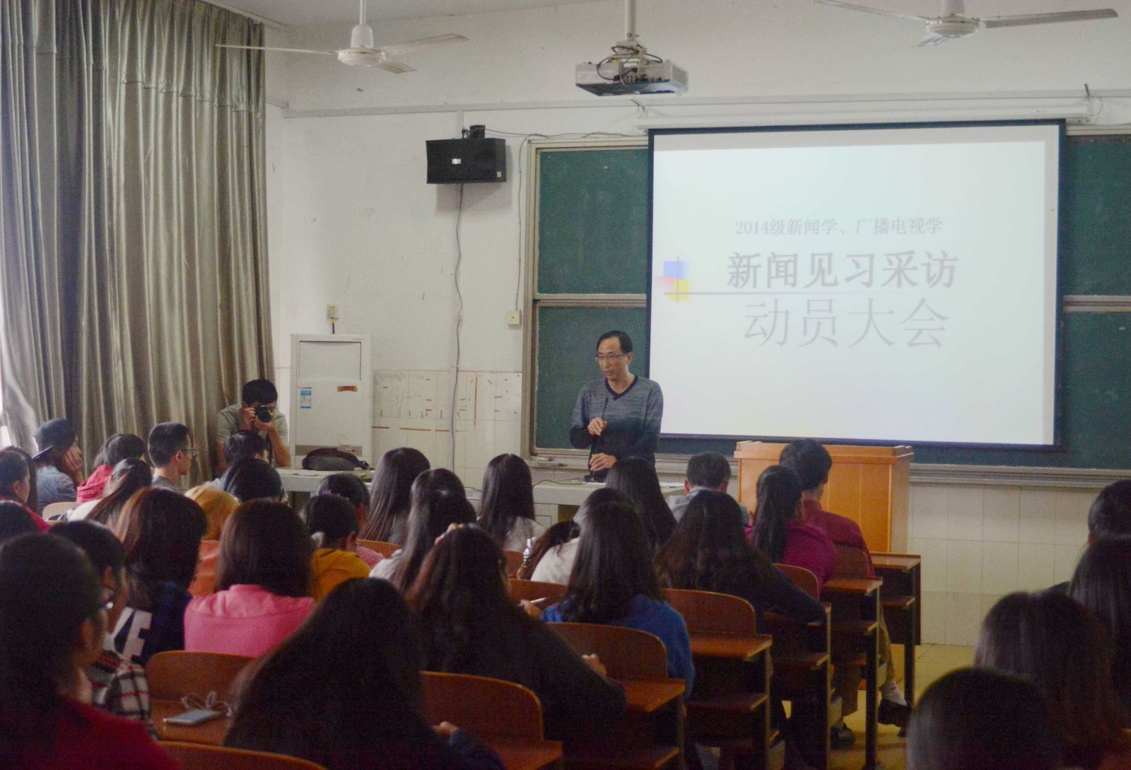 10月9日下午,公司2014级新闻学、广播电视学专业见习采访动员大会在文A609教室召开,公司党总支书记邓玉久,副经理彭军辉出席大会并发言。大会由陈小波副教授主持,各带队指导老师和2014级新闻、广电员工参加本次大会。