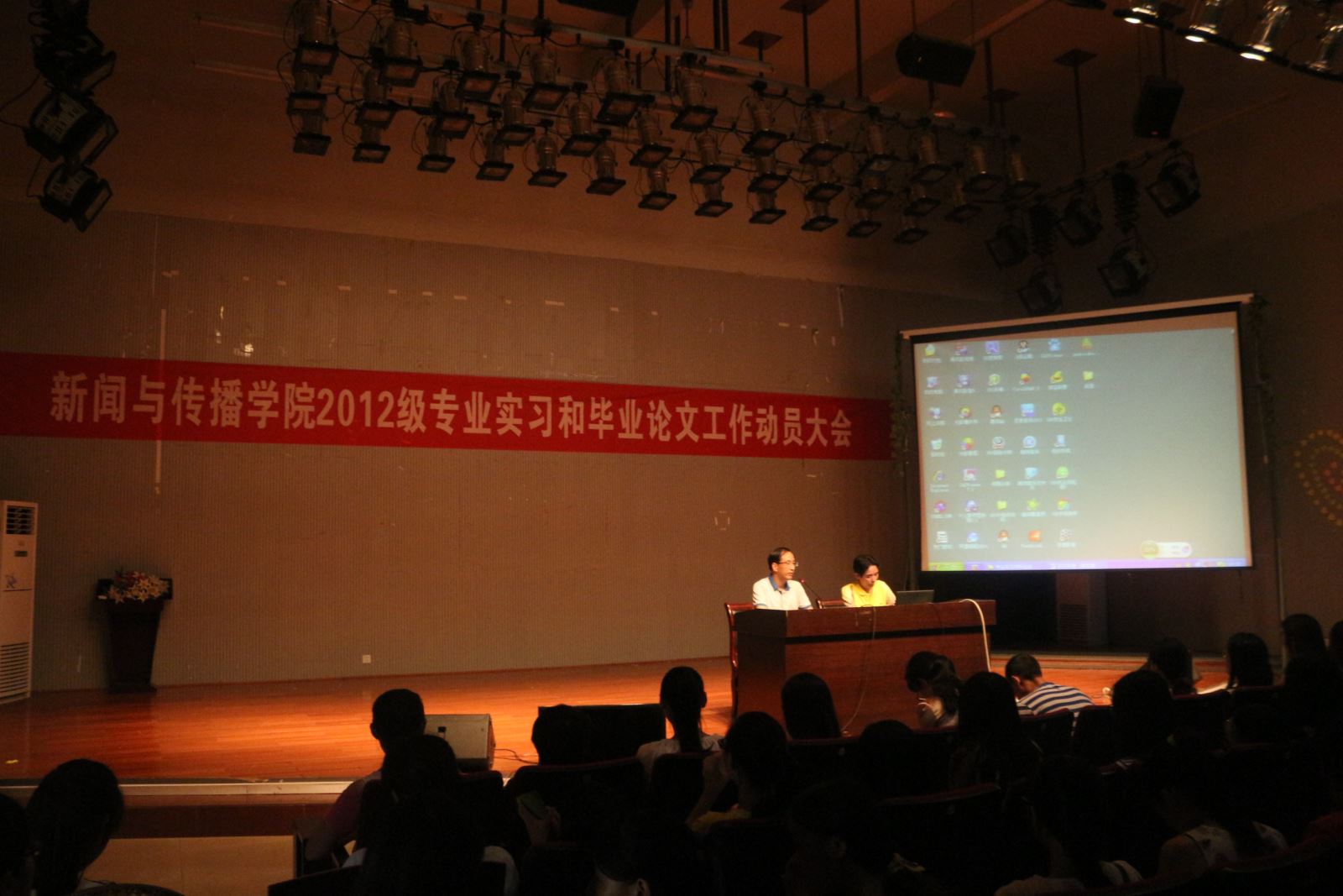 专业实习和毕业论文写作是教学安排中的重中之重,9月10日下午,乐天使在模拟演播厅召开2012级专业实习和毕业论文工作动员大会。新闻与传播公司党总支书记邓玉久、经理汤劲,党总支副书记周新文、办公室主任程昌出席大会并讲话,会议由副经理彭军辉主持。