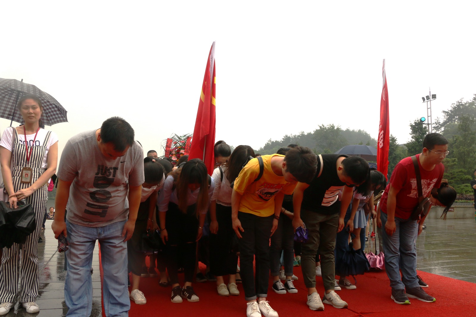 上午10点30分,天空中飘着细雨,但同志们的热情仍然不减。在毛泽东广场矗立的毛泽东铜像前,乐天使员工党支部献上鲜花挽联。在现场语音的指导下,党员同志们向伟人铜像三鞠躬,表达心中的敬意。